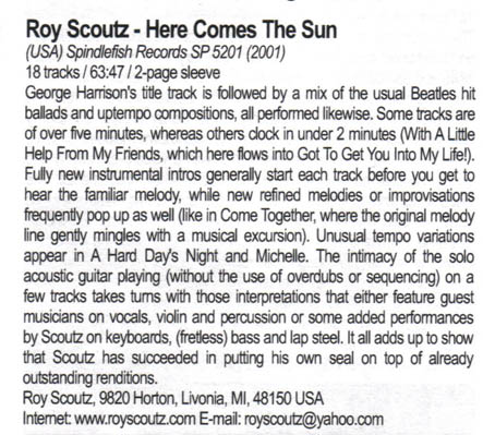 Being a Beatle Fan I have listened to many recordings that are Beatles related. The Most striking Difference in Roy's CD is how original many of the Arrangements are. With the use of Piano,Strings vocals,and acoustic guitar The Cd has many different colours. On some tunes we find fretless bass or piano playing the melody keeping the music always interesting. Some are also laced with surreal Background vocals giving great depth to a simple production. The guitar however is the main attraction here once again showing its versatility in the hands of a great Artist. |